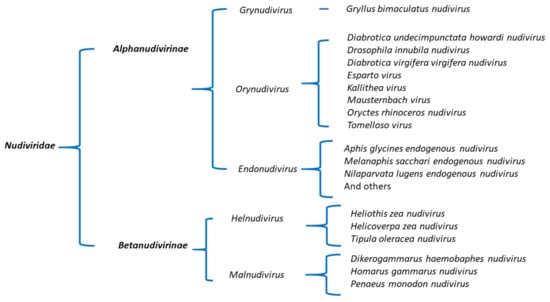 - Harrison, R.L.; Herniou, E.A.; Bézier, A.; Jehle, J.A.; Burand, J.P.; Theilmann, D.A.; Krell, P.J.; van Oers, M.M.; Nakai, M. and ICTV Report ConsortiumICTV Virus Taxonomy Profile: Nudiviridae. J. Gen. Virol. 2020, 101, 3–4. [Google Scholar] [CrossRef]