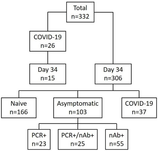 Schematic overview of the study. A total of 332 individuals participated: 306 in the cross-sectional part (one single sampling on 14 April 2020) and 26 patients suffering from non-severe COVID-19 in the longitudinal part with daily sampling. Out of 306 participants, 37 (12%) had previously been diagnosed with COVID-19, 103 (32%) had evidence of asymptomatic infection and 166 had no evidence of infection by SARS-CoV-2. Of the 103 asymptomatically infected, 23 were solely positive by PCR but had no neutralizing antibodies (nAbs), 55 (53%) had solely nAbs but were PCR negative and 25 (24%) had both, a positive PCR and nAb.