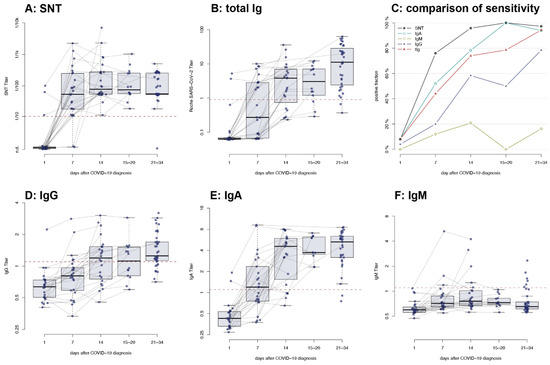 The serological response to SARS-CoV-2 was assessed in 24 patients. As previously mentioned, all patients developed a measurable nAb titer within 14 days of diagnosis (Figure 3A), and most patients developed an immune response measurable by electrochemiluminescence immunoassay (ECLIA, Figure 3B). Immunoglobulins (Ig) G and IgA could be detected in most patients, with the IgA response preceding IgG (Figure 3D,E). Interestingly, IgM was only detected in a minority of patients even after 14 days (Figure 3F). When compared, the serum neutralization test (SNT) was the most sensitive test for the detection of SARS-CoV-2-specific antibodies at the early stage of infection and maintained a high sensitivity throughout the entire study period (Figure 3C).