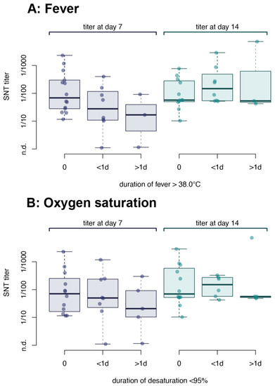Correlation of the severity of COVID-19 with the antibody response in young adults. Neutralizing antibody titers were correlated with (A) tympanic temperature and (B) oxygen saturation of symptomatic patients. Patients were grouped according to fever: no fever (never > 38.0 °C), fever < 24 h or fever ≥ 24 h or according to oxygen saturation: no desaturation (never < 95% spO2), <24 h desaturation or ≥24 h desaturation. Data were stratified according to the day of sampling relative to the day of diagnosis. No significant differences were observed between the groups by analysis of variance (p = 0.68 for fever and p = 0.66 for desaturation). n.d. = not detected.
