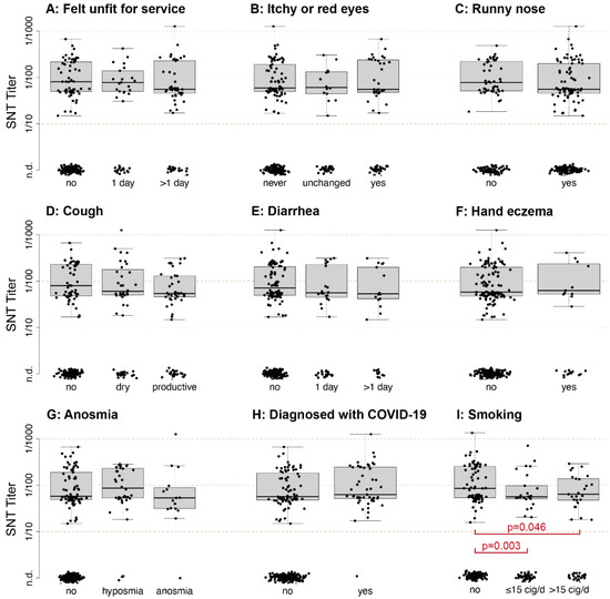 Correlation of symptoms and predisposing factors with the antibody response in young adults. Cross-sectional serum samples from 316 individuals were taken on the same day and neutralizing antibody titers were measured and plotted against self-declared symptoms experienced in the 30 days prior to sampling. Symptoms included general unfit feeling (A), itchy or red eyes (B), runny nose (C), cough (D), diarrhea (E), hand eczema (F), hyposmia or anosmia (G). Additionally, no differences in titers could be seen between the symptomatically and asymptomatically infected (H). (I) shows titers of individuals grouped by their smoking status: Individuals that smoked and produced nAbs showed significantly decreased titers as compared to non-smokers. Statistical significance was determined with the Wilcoxon rank sum test. p-values < 0.05 were considered statistically significant. n.d. = not detected.