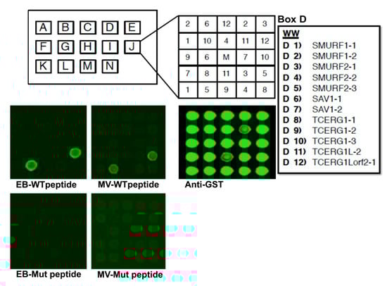 WW domain array screen. Purified GST/WW domain fusion proteins were arrayed in duplicate in Boxes A–N in numbered squares 1–12 as shown. The GST/WW domain fusion proteins present in Box D are shown. The array was screened with the following biotin-labeled peptides: EB-WT (MRRVILPTAPPEYMEAI-K-biotin), EB-Mut (MRRVILPTAAAEAMEAI-K-biotin), MV-WT (MQYLNPPPYADHGGANQL-K-biotin), or MV-Mut (MQYLNAAPAADHGANQL-K-biotin). A positive interaction was observed between SMURF2-3 (position #5) and both EB-WT and MV-WT peptides. An anti-GST control for protein expression is shown. The center M square contains GST alone.