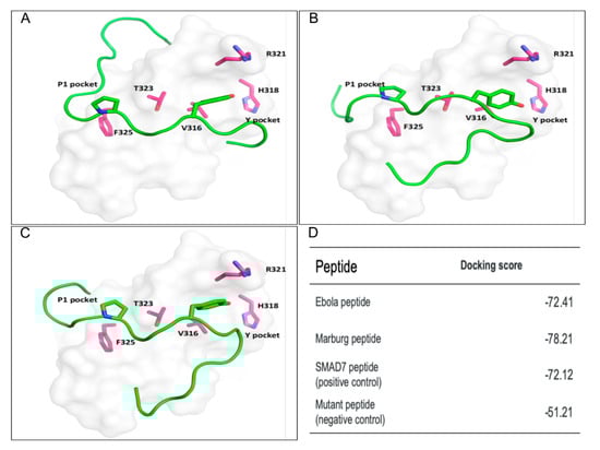 To support our finding of a possible interaction between the PPxY motifs of eVP40, mVP40, and the third WW domain of SMURF2, we performed docking analysis to model the VP40 PPxY/SMURF2 WW domain interface and assess the likelihood of this interaction occurring in infected cells. As a positive control for binding to the SMURF2 WW domain we used a PPxY peptide derived from SMAD7, a known biologically relevant SMURF2 binding partner [28]. The structure of WW3 domain from SMURF2 was obtained from PDB (PDB ID: 2LTZ), and we used the Glide module of Schrödinger’s to dock the eVP40 (Figure 2A) and mVP40 peptides (Figure 2B), as well as SMAD7 peptide (Figure 2C) to this WW domain. Modeling of the peptides (shown in green) as ligands for the modular SMURF2 WW3 domain (in grey) is shown with eVP40 peptide (Figure 2A) and mVP40 peptide (Figure 2B). Our results revealed that the mVP40 PPxY peptide had the best docking score compared to that of the eVP40 PPxY peptide and the positive control SMAD7 peptide. Moreover, the eVP40 peptide showed a comparable binding score to that of the SMAD7 peptide (Figure 2D).