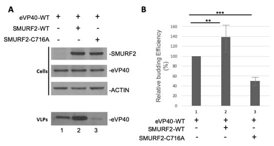 To investigate whether the eVP40/SMURF2 interaction was functional in regulating budding of VP40 VLPs as reported for other HECT family E3 ligases [4,11,12,13,14,15], we used our well-established VP40 VLP budding assay. Briefly, we transfected HEK293T cells with eVP40 alone or with equivalent amounts of either SMURF2-WT or the catalytically inactive mutant SMURF2-C716A. Cell extracts and VLPs were harvested and the indicated proteins were detected by Western blotting (Figure 5A). We observed a modest increase in eVP40 VLP budding in the presence of SMURF2-WT compared to eVP40 alone; however, we did not observe any increase in eVP40 VLP budding in the presence of SMURF2-C716A (Figure 5B graph is representative of three independent experiments) as compared to eVP40 alone. Excitingly, expression of SMURF2-C176A appeared to have a dominant negative effect on eVP40 VLP budding as the budding efficiency was reduced significantly in the presence of the catalytically inactive SMURF2-C176A mutant as compared to controls (Figure 5B). These data indicate that the enzymatic activity of SMURF2 is required to positively regulate eVP40 VLP budding.