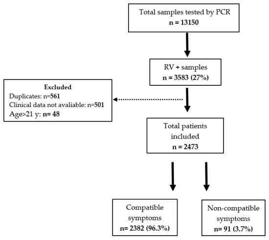 Children in whom RV was identified were classified into two groups according to their clinical presentation—children with compatible symptoms (RV symptoms group) and those presenting with conditions in whom RV was not thought to play a role in the clinical presentation (RV incidental group). A compatible clinical presentation was defined by the presence of respiratory symptoms, fever, and/or gastrointestinal symptoms [,,,]. Children with RV detection without any of these clinical manifestations were included in the RV incidental group. Most of these children were tested as part of pre-screening procedures.