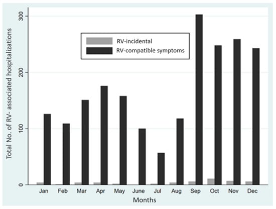 The horizontal axis shows the months of the year for RV detection in patients with compatible (black) symptoms and RV incidental detection. The vertical axis shows the total number of RV-associated hospitalizations in both groups.