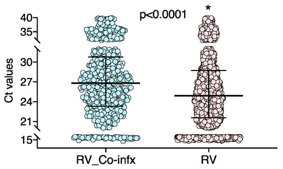 We also analyzed whether RV viral loads differed according to the clinical presentation and co-detection of other respiratory viruses. We did not find significant differences in RV loads in children with compatible symptoms versus those with incidental RV detection (Table 4). In children with compatible symptoms, RV viral loads were significantly higher (lower Ct values) than in children with RV mono-infections (n = 1850; 24.81 (21.53–25.88) CT values) than in those with RV viral co-infections (n = 532; 26.85 (23.41–30.68) CT values; p = 0.0001; Figure 3). These differences were not observed in children with incidental RV detection in whom RV viral loads in RV mono-infections and co-infections were not significantly different, i.e., (25.47 (22–29.07)) and (26.51 (23.9–27.3), respectively; p = 0.442).