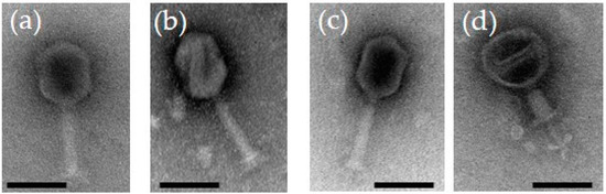 Transmission electron micrographs of negatively stained bacteriophages: (a) fPS-2; (b) fPS-90; (c) fPS-65; (d) fPS-65 with a contracted tail. The scale bar is 100 nm.