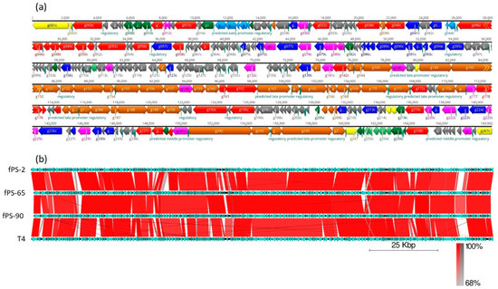 Gene organization in the fPS-phage genomes. Panel (a) Detailed genomic map of phage fPS-2. The gene colors indicate predicted functions of their products: Red, RNA and DNA maintenance proteins; Blue, dNTP/NTP metabolism associated proteins; Light blue, toxin-antitoxin system and phage immunity; Brown, phage particle-associated proteins (PPAPs); Yellow, membrane/peptidoglycan active proteins; Pink, endonucleases, homing endonucleases and exonucleases; Dark green, regulatory proteins; Light green, anti-restriction proteins; Grey, hypothetical proteins or phage proteins. The figure was generated using Geneious 10.2.6. Panel (b). BLAST alignment of the fPS-genomes with that of phage T4 drawn using the EasyFig tool [26]. The annotated genes and their orientations are indicated by filled arrows and the sequence BLAST identities of the corresponding genes between the phages by the red-shades quadrangles.