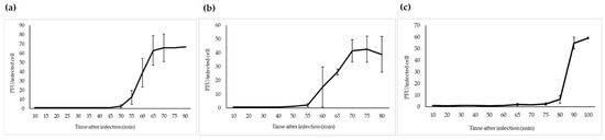 One-step growth curves of fPS-phages in Y. pseudotuberculosis O.1a strain PB1: (a) fPS-2; (b) fPS-65; (c) fPS-90. Error bars represent standard deviations (SD).