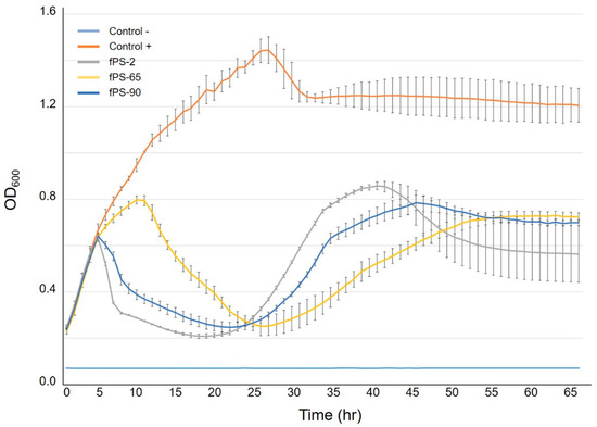 Growth curves of Y. pseudotuberculosis O:1a strain PB1 infected with phages fPS-2, fPS-65 and fPS-90 at a MOI of 0.001. Each curve represents the average results for five replicates. Error bars represent standard deviation (SD).