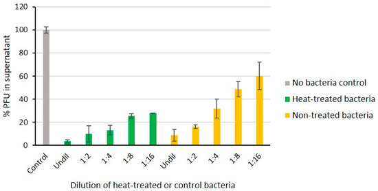 The fPS-65 receptor is heat-stable. Phages were incubated 15 min with different dilutions of heat-treated and non-treated bacteria. Shown are percentages of free phages in the supernatants after centrifugation when compared to no-bacteria control set to 100%. The boiled bacteria adsorbed the phages as well as or better than viable bacteria indicating that the phage receptor is intact. Error bars represent the standard deviations for the average plaque numbers in two parallels of two independent experiments.
