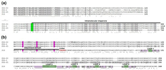 Multiple sequence alignments of Gp37 and Gp38 homologs of phages fPS-2, fPS-65, fPS-90 and Salmonella phage S16. Below the alignments symbols are used to indicate the similarity of the aligned amino acids: “*” indicates perfect alignment; “:” indicates that aligned amino acids belong to a group exhibiting strong similarity; “.” indicates that aligned amino acids belong to a group exhibiting weak similarity. Panel (a). Multiple sequence alignment of the N- and C-terminal sequences of the Gp37 homologs. Identical amino acids in all four sequences are highlighted in grey. The autocleavage site is highlighted in green and the intramolecular chaperone indicated by black line. Panel (b). Multiple sequence alignment of the sequences of the Gp38 homologs. Different functional regions are indicated for the S16 protein. The N-terminal attachment domain is indicated by a black line, and its critical N-terminal tryptophan residues are highlighted in purple. The linker sequence is highlighted in pink. The predicted receptor-binding loops 1–5 are indicated by green highlighting, and the flanking polyglycines in bold purple color with underlining. The differences between the fPS homologs are highlighted in grey.