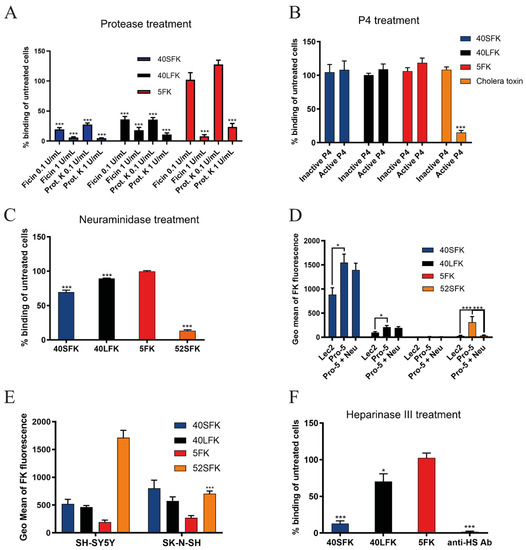 Receptor characterization for the short fiber of HAdV-F40: recombinant fiber knob binding to (A) A549 cells pretreated with the proteases—ficin and proteinase K—which degrade cell surface proteins; (B) A549 cells pretreated with P4—which inhibits glycolipid synthesis; (C) A549 cells pretreated with V. cholerae neuraminidase—which cleaves sialic acid. (D) CHO cells expressing or lacking sialic acid pretreated with V. cholerae neuraminidase (Neu). Pro-5 cells express sialic acid and Lec2 cells lack sialic acid expression. (E) SHSY-5Y cells expressing polysialic acid and SK-N-SH lacking polysialic acid, (F) A549 cells pretreated with heparinase III—which cleaves heparan sulfate. Binding was determined by geometric mean of fluorescence on a FACSLSRII flow cytometer and shown as % binding of fiber knobs on untreated cells in (A–C,F). All experiments were performed three times with duplicate samples in each experiment. Error bars represent mean ± SEM. * P < 0.05 and *** P < 0.001 versus control.
