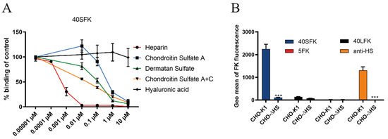 Effect of sulfation on FK binding: (A) 40SFK binding to A549 cells. Fiber knobs were pretreated with a broad range of concentrations of different glycosaminoglycans (GAGs). (B) Fiber knob binding to CHO cells expressing or lacking heparan sulfate (HS). HS expression levels are shown with an anti-HS antibody. The parental cell line CHO-K1 expresses GAGs and CHO-ΔHS specifically lacks HS but expresses other GAGs. Binding was determined by geometric mean of fluorescence on a FACSLSRII flow cytometer and shown as % binding of fiber knobs on untreated cells in (A). All experiments were performed three times with duplicate samples in each experiment. Error bars represent mean ± SEM. Error bars represent mean ± SEM. *** P < 0.001 versus control.