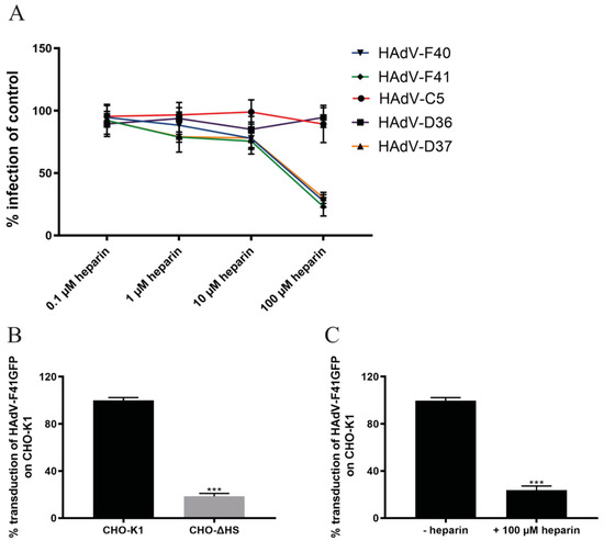 Since soluble, sulfated GAGs reduced 40SFK binding to A549 cells, we tested their effect on HAdV infection of A549 cells. Due to the close relationship between HAdV-F40 and -F41 SFKs, we hypothesized that GAGs may be of importance for both viruses and therefore included HAdV-F41 in the study. To investigate the importance of HS for these viruses, we first analyzed the effect of preincubating wild type (WT) viruses with different concentrations of heparin in infection experiments. A dose-dependent decrease in HAdV-F40 and -F41 infection was observed, with about 80% reduction at the highest concentration (Figure 3A). Heparin did not affect HAdV-C5 or HAdV-D36 infection but inhibited HAdV-D37, -F40 and -F41 infection with comparable efficiency. HS-binding HAdV-D37 was included as a positive control [22,36]. The reduction of HAdV-F40 and -F41 infection after preincubation with heparin indicated that the enteric HAdVs required an interaction with HS for infection of A549 cells. To further examine the SFK:HS interaction without interference from the LFK:CAR interaction, we used CHO-cells since they do not express human CAR. We transduced CHO-K1 and CHO-ΔHS cells with a GFP-expressing HAdV-F41 vector since CHO cells do not support viral hexon production used to quantify infection by WT viruses. Here, we observed an 80% decrease in transduction of the cells lacking HS (Figure 3B). No difference in transduction levels of CHO-ΔHS compared to CHO-K1 was observed with a GFP-expressing HAdV-C5 vector (data not shown). Additionally, upon pretreatment of HAdV-F41 vector with heparin, transduction was lowered to the same amount as in the CHO-ΔHS cells (Figure 3C). Taken together these results show that HS is important for the infection of cells by both HAdV-F40 and -F41.