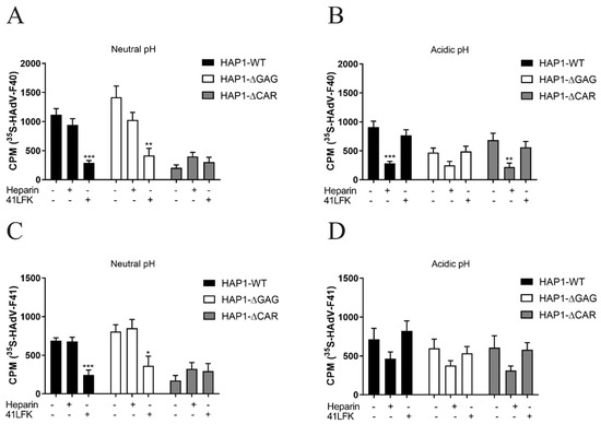 Effect of pH treatment on receptor usage: 35S-labeled HAdV-F40 and HAdV-F41 virion binding to HAP1 WT cells, HAP1-∆GAG cells and HAP1-∆CAR cells. The parental cell line HAP1 WT expresses glycosaminoglycans (GAGs) and CAR. HAP1-∆GAG lacks expression of GAGs, while HAP1-∆CAR lacks expression of CAR. (A) Untreated (neutral pH) HAdV-F40 or (B) acidic pH treated HAdV-F40 or (C) untreated (neutral pH) HAdV-F41 or (D) acidic pH treated HAdV-F41 were preincubated with heparin and cells were preincubated with 41LFKs before binding. Binding to cells was quantified as counts per minute (CPM) by a liquid scintillation counter. All experiments were performed three times with duplicate samples in each experiment. Error bars represent mean ± SEM. * P < 0.05, ** P < 0.01 and *** P < 0.001 versus control.
