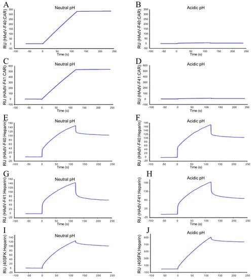 SPR analyses of HAdV-F40 and -F41 interactions with CAR and heparin and 40SFK interaction with heparin: (A) Untreated (neutral pH) HAdV-F40 or (B) acidic pH-treated HAdV-F40 or (C) untreated (neutral pH) HAdV-F41 or (D) acidic pH treated HAdV-F41 binding to immobilized CAR. (E) Untreated (neutral pH) HAdV-F40 or (F) acidic pH-treated HAdV-F40 or (G) untreated (neutral pH) HAdV-F41 or (H) acidic pH treated HAdV-F41 or (I) untreated (neutral pH) 40SFK or (J) acidic pH treated 40SFK binding to immobilized heparin. Interactions are displayed in response units (RU). All experiments were performed three times. Displayed is one representative set from each experiment.
