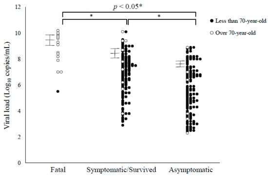 This study had some limitations. First, we could not follow up whether the asymptomatic cases subsequently developed the disease or not. Reports suggested that most asymptomatic cases did not onset, although the onset rates were different in each study [,]. Moreover, the viral load may fluctuate before and after the onset of the disease [,]. Thus, viral loads in the present asymptomatic cases may change after disease onset. Alternatively, Zheng et al. reported that the viral load in patients with severe disease continued to be high three to four weeks after disease onset []. Also, relatively small numbers of fatal cases (15 cases) were examined in this study. Further studies with a larger number of fatal cases are required.