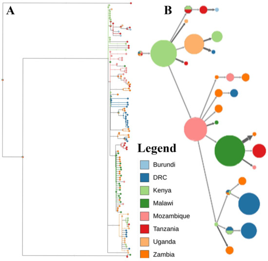 - Hakizimana, J.N.; Nyabongo, L.; Ntirandekura, J.B.; Yona, C.; Ntakirutimana, D.; Kamana, O.; Nauwynck, H.; Misinzo, G. Genetic analysis of African Swine fever virus from the 2018 outbreak in South-Eastern Burundi. Front. Vet. Sci. 2020, 7, 578474. Available online: https://www.frontiersin.org/articles/10.3389/fvets.2020.578474/full (accessed on 9 November 2020). [CrossRef] [PubMed]