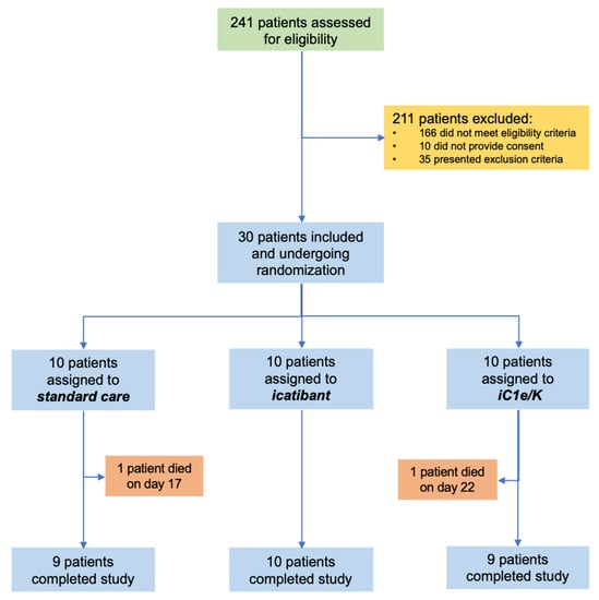 From 23 April 2020 to 14 June 2020, 241 patients were assessed for eligibility and 30 were included in the study (Figure 1; Tables S1 and S2). The inclusion criteria were strict in order to assure the inclusion of patients with severe COVID-19 only. The main reasons for exclusions were as follows: (i) despite clinical features compatible with COVID-19, diagnosis was not confirmed by PCR; (ii) beginning of symptoms over 12 days; (iii) baseline O2 saturation over 94%. During the study period, the total number of patients screened accounted for 90% of all patients seeking medical attention at the Hospital & Clinics of the University of Campinas due to clinical suspicion of COVID-19. Patients included in the study represented 31% of all patients diagnosed with COVID-19 during this period. Table 1 presents the reasons for the exclusion of screened patients. Table S2 provides the chronological sequence of inclusion and randomization. Ten patients were randomized to each group: standard care, icatibant, and iC1e/K. Throughout the study, supporting medication was provided upon medical decision (Table S3).