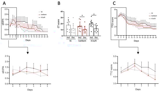 Major clinical and image-related outcomes. The quick sepsis-related organ failure score (qSOFA) was determined daily throughout hospitalization (A). Computed tomography lung score was obtained at inclusion and discharge (B). Time to clinical improvement (TTCI) was determined daily throughout hospitalization (C). Insets represent qSOFA (A) and TTCI (C) during the initial five days of treatment. The Kruskal–Wallis test was employed to compare groups (A,C) and a paired Students t-test was used to compare pre- versus post-intervention condition (B). Results are presented as mean ± standard deviation. * p < 0.05. Dsc, discharge; iC1e/K, inhibitor of C1 esterase/kallikrein; Incl, inclusion; SC, standard care.