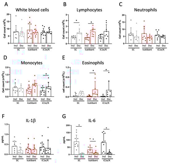 Blood immune cell and cytokine outcomes. White blood cells (A), lymphocytes (B), neutrophils (C), monocytes (D), and eosinophils (E) were determined by the automated method in blood samples collected at inclusion and discharge. Interleukin-1 beta (F) and interleukin-6 were determined using ELISA kits in serum samples collected at inclusion and discharge. Dsc, discharge; iC1e/K, inhibitor of C1 esterase/kallikrein; IL-1b, interleukin-1 beta; IL-6, interleukin-6; Incl, inclusion; SC, standard care. Non-parametric Wilcoxon test was used for comparisons between pre- and post-intervention (A–G). Results are presented as mean ± standard deviation. * p < 0.05.