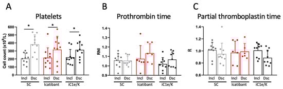 Coagulation-related parameters. Blood platelet counts (A), prothrombin time (B), and partial thromboplastin time (C) were determined in blood samples collected at inclusion and discharge. Dsc, discharge; iC1e/K, inhibitor of C1 esterase/kallikrein; Incl, inclusion; SC, standard care. Non-parametric Wilcoxon test was used for comparisons between pre- and post-intervention. Results are presented as mean ± standard deviation. * p < 0.05.