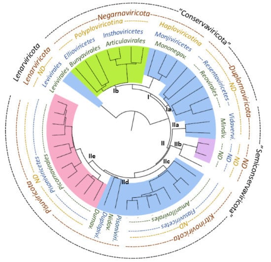 - Wolf, Y.I.; Kazlauskas, D.; Iranzo, J.; Lucía-Sanz, A.; Kuhn, J.H.; Krupovic, M.; Dolja, V.V.; Koonin, E.V. Origins and evolution of the global RNA virome. mBio 2018, 9, e02329-18. [Google Scholar] [CrossRef] [PubMed]