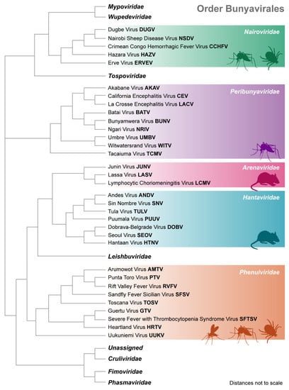 In 1975, a group of serologically related, tri-segmented, negative-sense RNA viruses were grouped together by the International Committee on Taxonomy of Viruses (ICTV) as the Bunyaviridae family []. In 2016, the ICTV elevated Bunyaviridae to an order, Bunyavirales, to incorporate the increasing number of related viruses and new family classifications []. As of May 2019, the order contains 13 families (Figure 1, Table 1) whose viruses infect a variety of plants, animals, and insects, including Cruliviridae (crustaceans), Fimoviridae (plants), Leishbuviridae (parasites), Mypoviridae (insects), Phasmaviridae (insects), Tospoviridae (plants), Wupedeviridae (millipedes), and an Unassigned family containing a citrus tree bunyavirus []. Further, five families (Arenaviridae, Peribunyaviridae, Nairoviridae, Phenuiviridae, and Hantaviridae) contain notable human pathogens that cause mild to severe disease, including fevers, hemorrhagic disease, encephalitis, and respiratory disease [,].