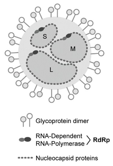 Bunyavirales Generalized Virion. Although bunyaviruses can vary in number of genomic segments and glycoprotein dimer structure, all viruses share a similar structure. Nucleocapsid proteins coat the single-stranded anti-sense RNA genomes and along with the RNA-dependent RNA-polymerase form ribonucleoproteins on each segment. The genomic segments are packaged in an enveloped virion studded with the viral glycoproteins. The genomic small, medium, and large segments are labeled S, M, and L, respectively.