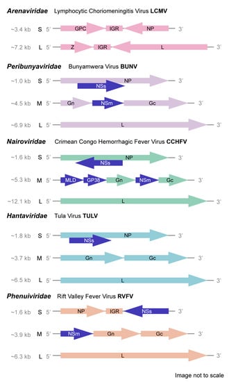 Although these human pathogenic viruses are diverse in host pathogenicity, they share common features including segmented, linear, single-stranded antisense or ambisense RNA genomes []. Further, they are primarily transmitted by arthropod vectors including mosquitoes, ticks, and sandflies [,], although some such as arenaviruses and hantaviruses are spread directly from rodents to humans []. Bunyaviruses present a serious threat to public health as multiple viruses within the order are at risk of spread to non-endemic areas due to the expanding range of their vectors []. Further, these emerging viruses pose a continuous threat not only to human health but also to agriculture and livestock due to the diversity in targeted hosts []. Viruses of the Bunyavirales order share a similar structure. Multiple copies of the nucleocapsid (NP) protein encapsulate genomes, while the glycoproteins coat the enveloped virion [,] (Figure 2). The RNA-dependent RNA-polymerase (RdRp), along with the NPs, forms a ribonucleoprotein (RNP) on each genomic segment [,] (Figure 2), although some encode for additional functions. Across the order, genomes consist of two to six segments and this can vary even within specific families. For example, viruses in the Arenaviridae, Wupedeviridae, and Unassigned families typically have bi-segmented genomes, while viruses in Fimoviridae and the Phenuiviridae subfamily tenuivirus can have four to six [,,,,,]. However, generally bunyaviruses have three genomic segments: the small (S) segment of ~1–2kb, medium (M) segment of ~3.7–5kb, and the large (L) segment varying from ~6.8–12kb [,] (Figure 2 and Figure 3).