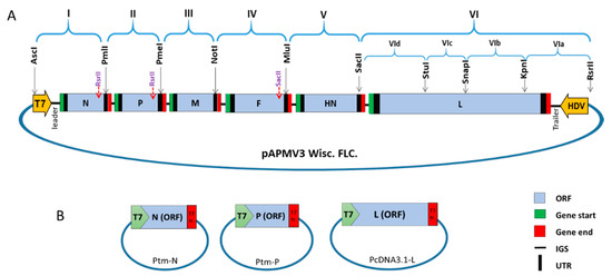 A multiple cloning site oligonucleotide (polylinker) was designed to contain RE sites used for cloning of the complete virus genome (Figure S2). The polylinker was cloned into the pBR322/dr plasmid between AscI and RsrII sites. This cDNA was used as a template to create the virus subgenomic fragments by PCR using primers bearing the RE sites (Table S1) and high-fidelity platinum pfx polymerase enzyme (Invitrogen™). The subgenomic fragments were cloned sequentially into the prepared vector. The L gene was cloned first in a reverse order (Figure 1A; starting from VIa to VId) followed by insertion of other fragments to form the antigenomic full-length clone (FLC) of APM3 strain Wisconsin. Each fragment was confirmed for absence of any unintended mutation by sequence analysis using a big dye terminator kit. A T7 RNA polymerase promotor sequence was inserted before the virus anti-genomic leader and a the HDV ribozyme sequence was inserted after the virus anti-genomic trailer. The resulting APMV-3 Wisc. full-length expression plasmid was termed “pAPMV3 Wisc. FLC.” (Figure 1A).