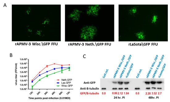 Characterization of rLaSota\GFP, rAPMV-3 Wisc.\GFP and rAPMV-3 Neth.\GFP in DF-1 cells. (A) Fluorescent foci of the three recombinant vectors expressing GFP in DF-1 cells two days-post-infection. (B) Multicycle growth kinetics of the three viruses in DF-1 cells at 12 h intervals using 0.01 MOI of each virus. (C) Western blot for GFP expressed by the three viral vectors using 0.5 MOI of each virus in DF-1 cells. Cell lysate was collected 24 and 48 h post-infection and analyzed by Western blot using rabbit GFP antibodies and mouse B-tubulin antibodies.