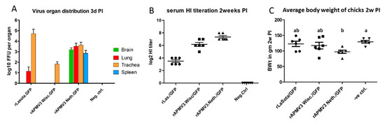 An in vivo study was performed to compare tissue distribution and humoral antibody response of the three APMV vectors in chickens. Our results showed that rAPMV-3 strain Netherlands propagated in different body organs; brain, lung, trachea, and spleen with remarkable titers after intraocular vaccination of day-old chickens, whereas rAPMV-3 strain Wisconsin and rLaSota vectors were confined only to the respiratory tract by the third day post-infection. The wide propagation of APMV-3 strain Netherlands came at the expense of mild pathogenicity observed in young chickens shortly after their vaccination. APMV-3 strain Netherlands vaccinated group showed decreased feed intake, early retarded growth (Figure S4), and abnormal (mal) feathering. A similar observation of stunted growth was previously reported in young chickens experimentally infected by APMV-3 strain Netherlands [23]. On the other hand, both rAPMV-3 strain Wisconsin and rLaSota vaccinated groups did not show any observable pathogenicity.