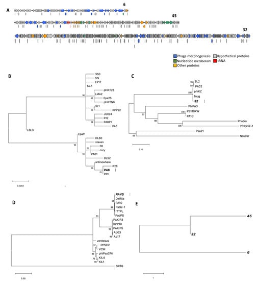 Genomes and phylogenetic trees of phages 6, 45, and 32. (A) The predicted coding sequences (CDSs) are indicated by arrows. CDSs predicted to encode structural proteins are indicated in blue, hypothetical proteins in grey, and nucleotide metabolism in green. Genes predicted to encode transfer RNA are indicated in red and yellow shows other proteins. (B–D) Phylogenetic tree showing the relationships of the major capsid, of three phages. (E) A single phylogenetic tree of head protein, tail protein, and terminase large subunit combined, of phages 6, 32, and 45. The tree was inferred by using the maximum likelihood (ML) method based on the Whelan and Goldman model []. The analyses were conducted in MEGA.