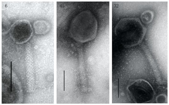 The transmission electron microscopy analysis revealed a Myoviridae morphology for all three phages. Phage 6 was the smallest phage, with an icosahedral head of approximately 76 × 76 nm connected to a 170 nm tail; and phage 32 was the biggest phage, with an icosahedral head of approximately 166 × 150 nm and a 250 nm long tail. Phage 45 possessed a head with dimensions of 156 × 125 nm attached to a 234 nm long tail (Figure 3). Phage 6 was shown to have a latency period of 60 min and the smallest burst size of 6.9 ± 0.5. Phage 32 had the longest latency period (100 min) and a burst size of 14 ± 2.9. Phage 45 possessed the shortest latency period (50 min), and the biggest burst size of 250 ± 107.