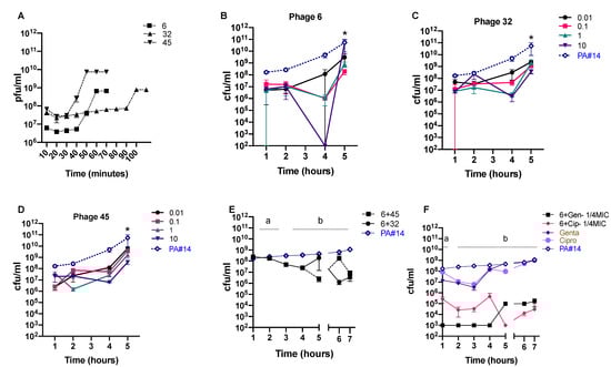 Effect of phage and antibiotic treatment in killing a P. aeruginosa strain from a wound patient. (A) A single-step growth curve of three phages; (B–D) efficacy of phages 6, 32, and 45 against P. aeruginosa isolate #14 at different multiplicities of infection (MOIs); (E) effect of a two-phage cocktail (6 + 32 and 6 + 45) against P. aeruginosa isolate #14; (F) effect of phage 6 in combination with two different antibiotics (gentamicin and ciprofloxacin) on P. aeruginosa isolate #14. PA#14, P. aeruginosa isolate #14. Points connected by the same letter (a or b) are not significantly different; asterisks show significant differences (p < 0.05, two-way ANOVA, Tukey’s multiple comparisons test). Error bars represent three biological replicates. Four different MOIs: 0.01, 0.1, 1, and 10 were used for panels B, C, and D, while a MOI of 1 was used for panels E and F. Bacteria-only controls are in blue; antibiotic + bacteria controls are in brown. Dashed lines in panels B, C, and D represent one common control.