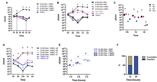 Combinations of phage and antibiotic treatments against a multi-resistant P. aeruginosa strain. (A,B) Effect of phage + antibiotic combinations on P. aeruginosa isolate #14. (C) Densities of phages at three different time points of the treatment. (D) Bacterial killing effect of phages and gentamicin 1/4 minimum inhibitory concentration (MIC) against P. aeruginosa isolate #14 at lower initial concentrations (106 and 107 cfu/mL). (E) Efficacy of phages against P. aeruginosa isolate #14 after 12 h of co-incubation and at different stages of the exponential phase (early, middle, and late). (F) Proportion of colonies resistant or susceptible to one or all phages, after 12 and 24 h of co-incubation with phages and antibiotics. PA #14, P. aeruginosa isolate #14; I, phage 6+ phage 32; and ii, phage 6+ phage 45. Points connected by the same letter are not significantly different (p < 0.05, two-way ANOVA, Tukey’s multiple comparisons test). Error bars represents three biological replicates. Bacteria-only controls are in blue, while the antibiotics + bacteria controls are in brown.