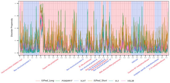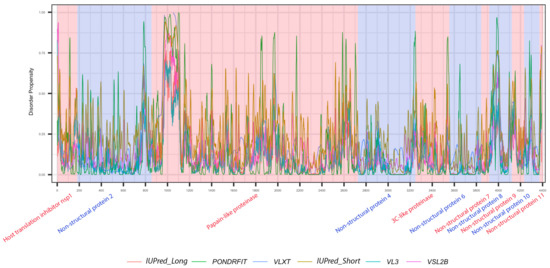 Positional distribution of the predicted intrinsic disorder of individual proteins generated by the cleavage of ORF1ab polyproteins in the MERS-CoV genome. Each color represents a per-residue disorder profile generated by IUPred_Long, PONDRFIT, VLXT, IUPred_Short, VL3, or VSL2B. Residues with scores above 0.5 are considered disordered.
