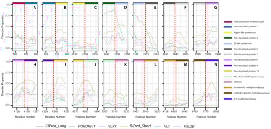 Disorder propensities of individual proteins generated by the cleavage of ORF1ab protein from MERS-CoV. Plots show the positions of cleavage sites within disorder profiles at the junctions between the cleaved products. (A) Cleavage site between host translation inhibitors nsp1 and nsp2. (B) Cleavage site between nsp2 and papain-like proteinase. (C) Cleavage site between papain-like proteinase and nsp4. (D) Cleavage site between nsp4 and 3C-like proteinase. (E) Cleavage site between 3C-like proteinase and nsp6. (F) Cleavage site between nsp6 and nsp7. (G) Cleavage site between nsp7 and nsp8. (H) Cleavage site between nsp8 and nsp9. (I) Cleavage site between nsp9 and nsp10. (J) Cleavage site between non-structural protein 11 and RNA-directed RNA polymerase. (K) Cleavage site between RNA-directed RNA polymerase and helicase. (L) Cleavage site between helicase and guanine-N7 methyltransferase. (M) Cleavage site between guanine-N7 methyltransferase and uridylate-specific endoribonuclease. (N) Cleavage site between uridylate-specific endoribonuclease and 2’-O-methyltransferase.