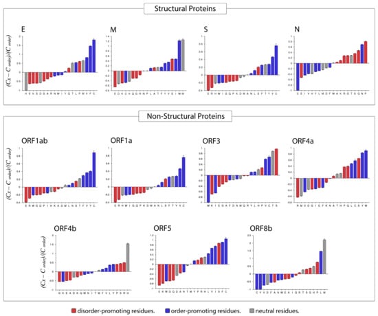 Compositional Profiler was used to compute the fractional compositional difference of the MERS-CoV proteome relative to a set of highly ordered proteins. This analysis was guided by the critical observation that disordered proteins/regions have noticeably different amino acid compositions than do ordered proteins/regions. For the comparative analysis, the enrichment or depletion of individual amino acids was determined and plotted (from most depleted to most enriched) with annotation as to whether a residue was disorder-promoting (A, R, S, Q, E, G, K, and P), order-promoting (N, C, I, L, F, W, Y, and V), or neutral (D, H, M, and T) (Figure 8).