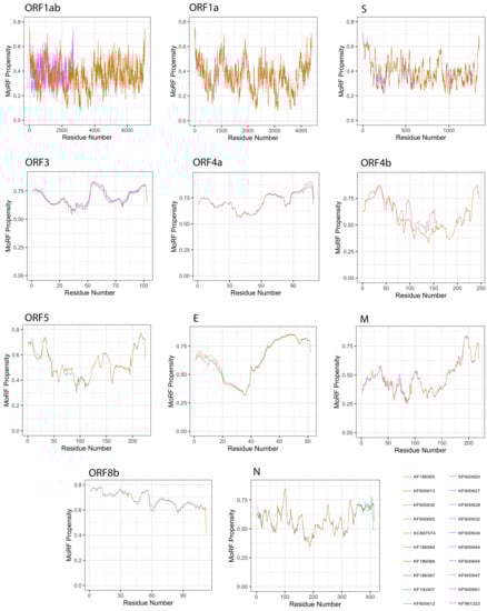 Given a protein sequence, MoRFchibi predicts for each residue the probability that it is a part of a MoRF, with a value of 0.725 or higher being indicative (Figure 9). Our results revealed that the mean MoRF content of the MERS-CoV proteome is 1.89%. Curiously, MoRF potentials were mostly unaffected by the natural variability among MERS-CoV proteins from different isolates.