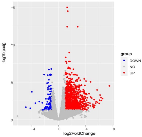 To ensure the quality and reliability of data analysis, it was necessary to filter the original data. Reads with adapters, undetermined base information, and low quality were removed. Clean reads were quickly and accurately compared with the reference genome using Hisat2 v2.0.5 to obtain the localization information of reads on the reference genome []. The Integrative Genomics Viewer (IGV) was used for visual browsing in combination with the species reference genome and annotation files. The new transcripts were assembled by StringTie (v1.3.3b) in a novel network flow algorithm as well as with an optional de novo assembly approach []. The number of reads covered from start to finish for each gene (including the new predictive gene) was counted based on the location information of gene alignment on the reference genome. This part of the analysis uses FeatureCounts v1.5.0-p3 []. The obtained read count value was then corrected for sequencing depth and gene length to obtain FPKM values (FPKM, the expected number of fragments per kilobase of transcript sequence per million base pairs sequenced). Considering the biological duplication in this experiment, the DESeq2 R package was used for differential analysis [,]. The screening criteria for differentially expressed genes (DEGs) were padj < 0.05 and |Log2 (FC)| > 1 (fold change). Then, the clusterProfiler R Package was used for gene ontology (GO) and pathway enrichment analysis [].