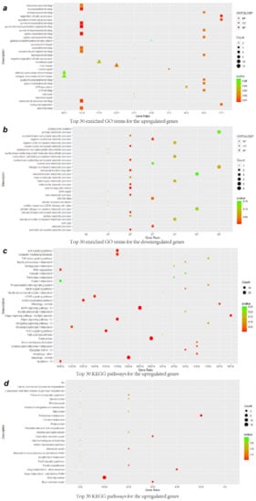 Bubble plots comparing GO enrichment and KEGG pathway analysis. (a) The 30 most significantly enriched GO terms for upregulated DEGs. (b) The 30 most significantly enriched GO terms for downregulated DEGs. (c) The 30 most significantly enriched KEGG pathways for upregulated DEGs. (d) The 30 most significantly enriched KEGG pathways for downregulated DEGs. The size of the bubble represents the number of enriched DEGs. The color represents the p-value of the enrichment. The shape of the bubble represents the ontology; circles represent BP, triangles represent CC, and squares represent MF.