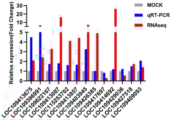 The relative expression results showed that the FC was between 0.84 and 6.41 (Figure 4). Among the 13 analyzed genes, the expression trends of 12 genes were consistent, and the trend of 1 gene was inconsistent. There was a high consistency between the RNA-Seq and RT-qPCR data (92.3%). Moreover, the expression levels of 8 genes were significantly upregulated (p < 0.05). The IDs of these genes are LOC109413675, LOC109396991, LOC109622167, LOC109413087, LOC109413857, LOC109403945, LOC109427518, and LOC109409093, and the FC range was 1.50–6.41. Furthermore, to assess the physiological development processes of these 13 genes in C6/36 cells, we also verified their relative expression at 1 and 2 dpi (Table 2). At 1 dpi, the FC range was 0.03–1.89, and the expression of LOC109396991 and LOC109429036 was significantly upregulated (p < 0.05). At 2 dpi, the FC value was between 0.55 and 1.85, and the expression of LOC109396991 and LOC109429036 was significantly upregulated (p < 0.05), while the expression of LOC109426385, LOC109417697, and LOC109427518 was significantly downregulated (p < 0.05).