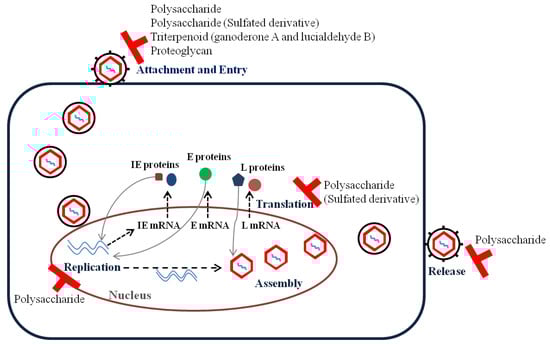 - Li, Z.; Liu, J.; Zhao, Y. Possible mechanism underlying the antiherpetic activity of a proteoglycan isolated from the mycelia of Ganoderma lucidum in vitro. BMB Rep. 2005, 38, 34–40. [Google Scholar] [CrossRef]