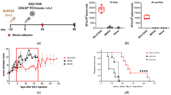 To assess the therapeutic efficacy of IDLV-OVA in B16OVA model, three groups of mice were inoculated s.c. with 2 × 105 B16OVA and when tumor mass was palpable, mice were vaccinated with 10 × 106 RT units/mouse of IDLV-OVA, IDLV-Mock, or left untreated, following a protocol schedule depicted in Figure 2a. Fourteen days after immunization blood samples were collected to perform IFNγ ELISpot assay. All IDLV-OVA treated mice showed high levels of OVA-specific response (1873 ± 296 mean SFC/106 cells), very low or undetectable in control mice (57 ± 84 and 40 ± 63 in Mock and Naïve groups, respectively) (Figure 2b). In all naïve and mock-injected mice, the tumor continued to grow, and all control mice were sacrificed within 18 days (Figure 2c,d). On the contrary, all IDLV-OVA vaccinated mice showed a significant control of tumor growth compared with control groups (Figure 2c). Tumors started to grow again 20 days after immunization and all vaccinated mice died within 45 days from the immunization (Figure 2d). These data indicate that a single immunization with IDLV-OVA was able to induce a significant delay of a very aggressive melanoma growth and a significant increase in survival (p < 0.0001).