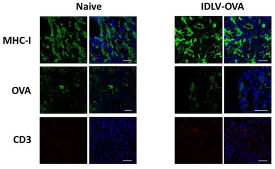 Confocal laser scanning microscopy (CLSM) analyses on mice tissue sections. Representative images of tumor from Naïve and IDLV-OVA mice are shown. Tissue sections 8 µm thick were stained for MHC Class I (green), OVA (green), or CD3 (red) as indicated (left columns) and for DAPI as nuclear staining (blue, right columns). Images represent a 3D reconstruction of 30–40 single Z-stack. Results from one representative experiment are shown for each analysis. Scale bars are 40 µm.
