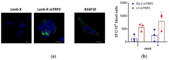 TRP2, expressed by most human melanoma cells, represents an attractive target for melanoma vaccines. The murine tumor cell line B16F10 is an aggressive clone derived from B16 cells and expresses the murine (m) homologous of human (h) TRP2. To verify the expression of the codon optimized mTRP2 generated for the production of lentiviral vectors used in this study, Lenti-X cells were transfected with the plasmid expressing mTRP2 and analyzed by confocal microscope, using B16F10 as a positive control. The images confirmed consistent expression in both B16F10 and transfected LentiX cells (Figure 4a).